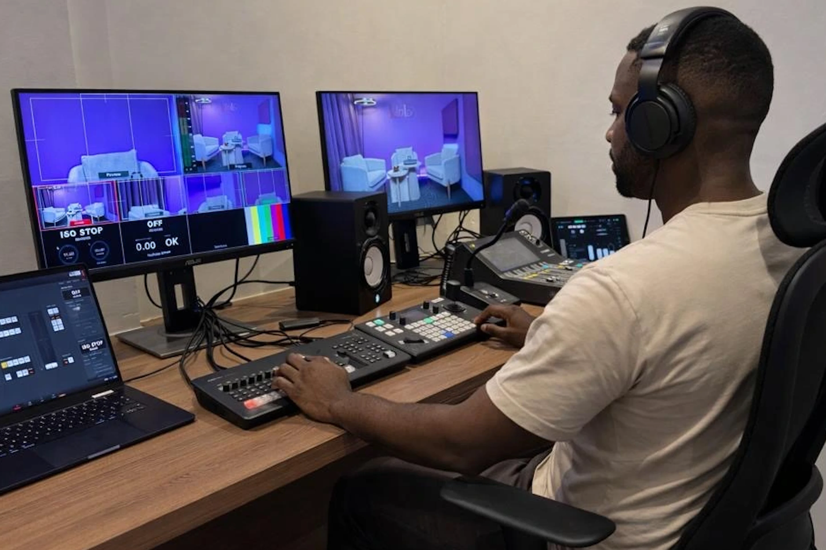 Un espace de contrôle équipé de technologies de pointe, pensé pour piloter vos productions en toute fluidité. De la captation à la réalisation, la régie Klolé assure un suivi précis de l’image et du son, pour des contenus maîtrisés, professionnels et prêts à être diffusés.
