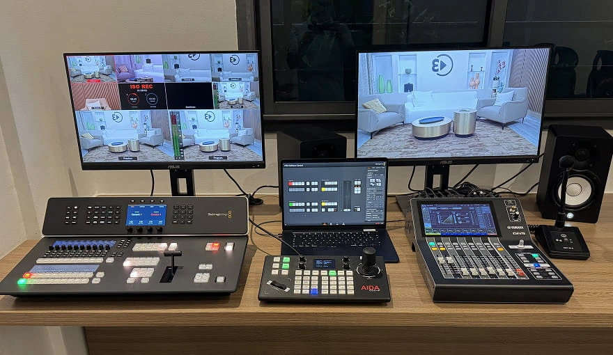 Mélangeur vidéo Blackmagic, Mélangeur audio Yamaha, Contrôleur caméra PTZ